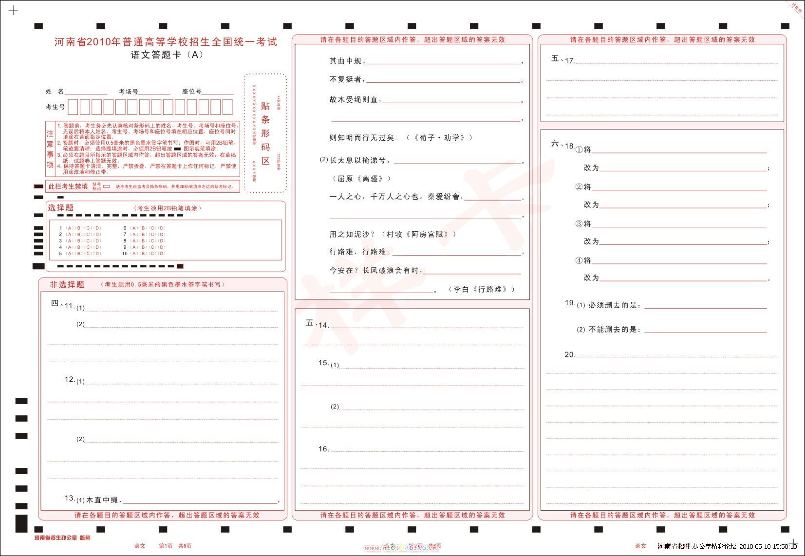河南省招生办公室关于公布2010年普通高考模拟答题卡样的通知各省辖市招办、重点扩权县(市)招办:今年,我省普通高考答题卡将分A卡和B卡。